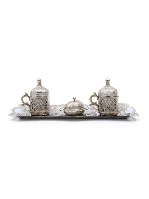 터키어 금속 튤립 모티브 실버 2’li 커피 컵 패드 정통 터키어 커피 에스프레소 컵 도자기 서빙 세트 구리 트레이 꽃